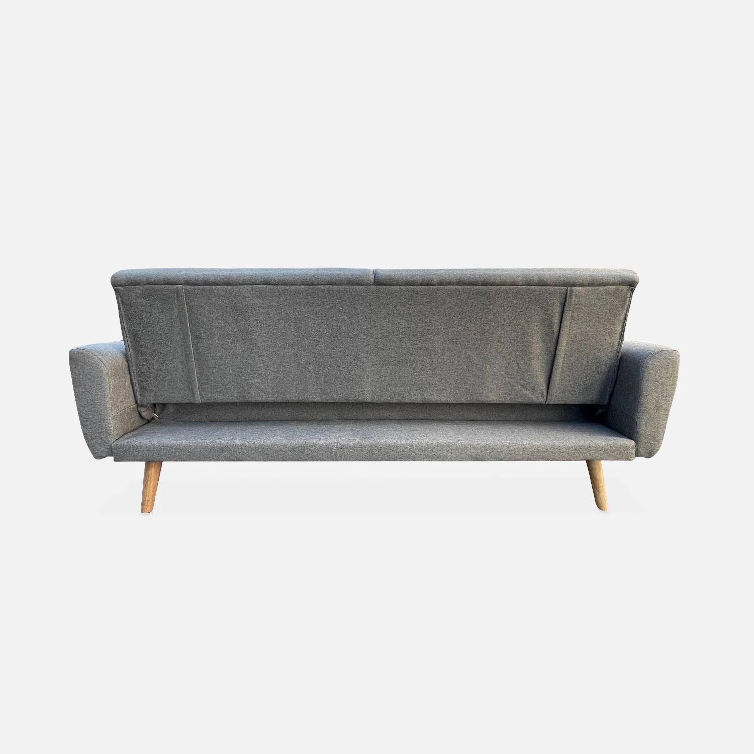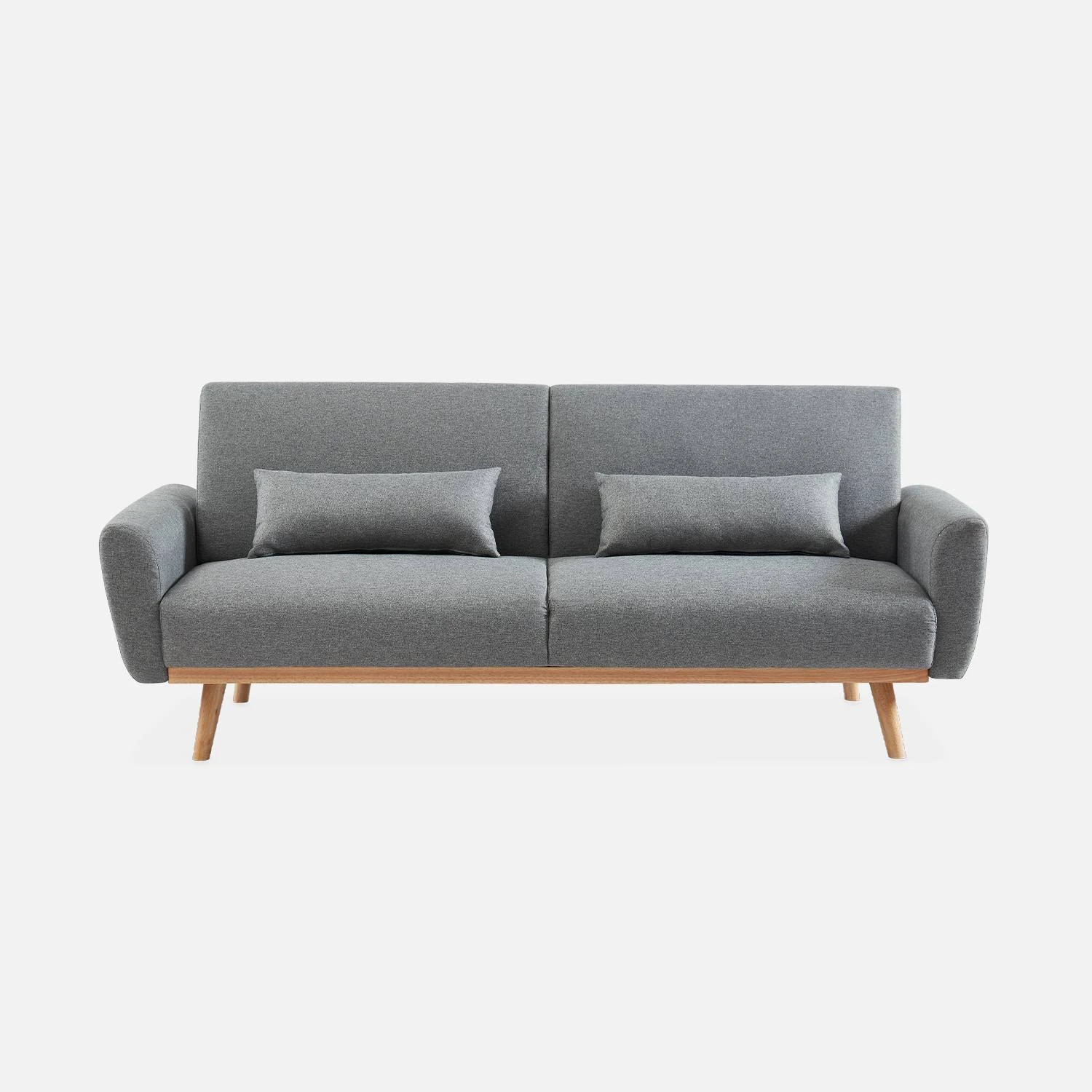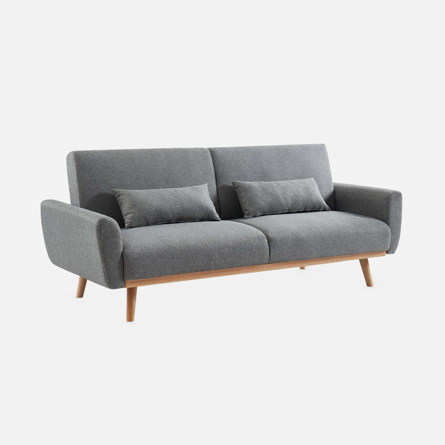 De belles formes pour ce canapé OSKAR, au tissu confortable et au piètement bois oblique minimaliste. Vous serez également séduit par son système instantané d’inclinaison de dossier en 3 positions; canapé, dossier incliné ou encore position lit, à plat. L’assise et le dossier sont confectionnés avec une mousse dense et un système de soutien par ressorts et sangles élastiques, de quoi rendre l’ensemble très confortable tout en garantissant une assise ferme.