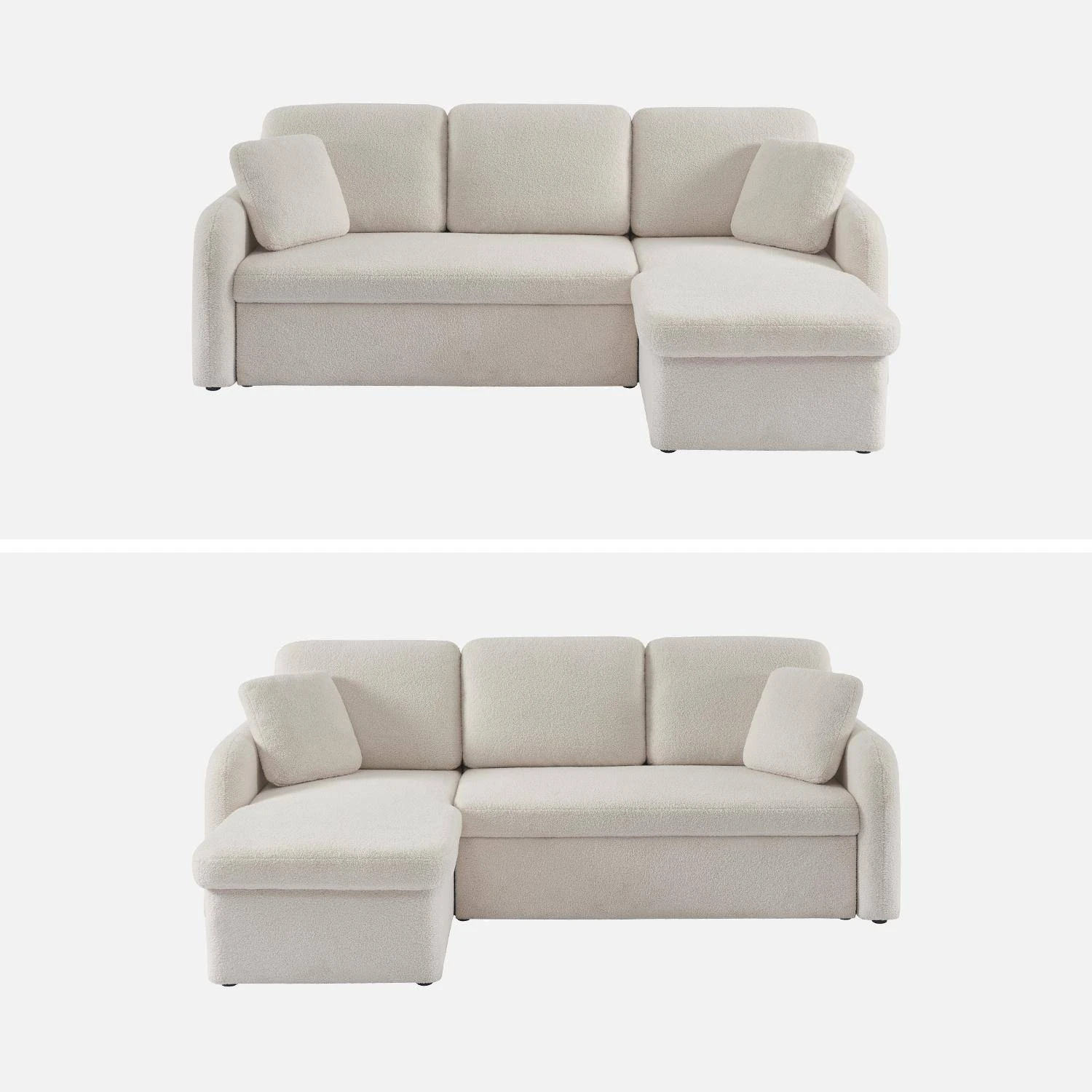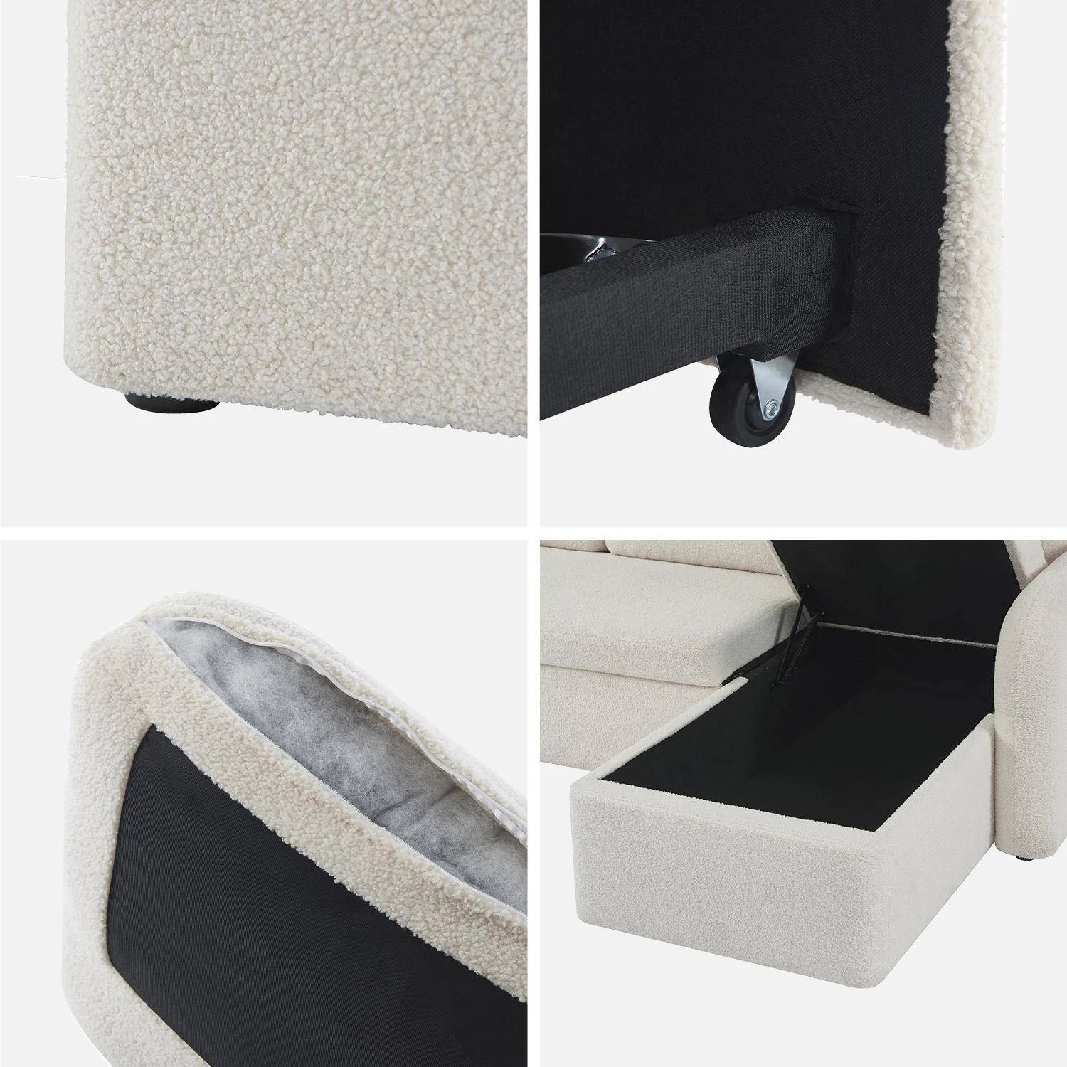Prenez une pause confort sur notre canapé Milano et ses deux petits coussins inclus. Moderne et élégant, il a tout ce qu’il faut pour vous séduire : une assise ferme, des dossiers confortables et un revêtement bouclettes, effet laine de mouton, doux au toucher. Vous avez besoin d’un couchage supplémentaire ? Vous pouvez compter sur ce canapé qui se transforme en lit pour 2 personnes en un clin d’œil ! Retirez les coussins, relevez le tiroir-lit et le tour est joué ! Et pour ranger vos draps et couvertures, le coffre de rangement caché sous la méridienne sera parfait. La méridienne peut d’ailleurs être placée à gauche ou à droite selon vos envies.