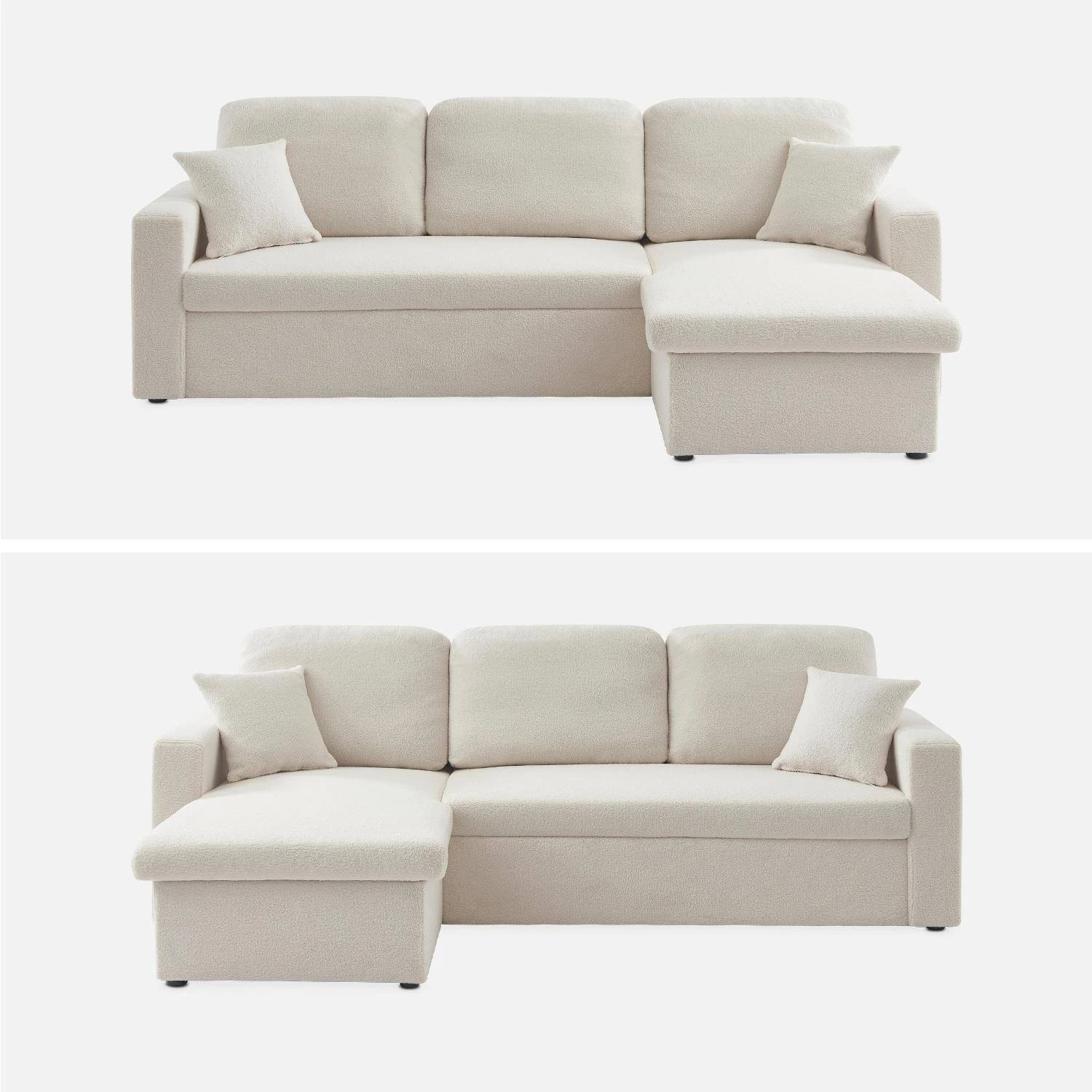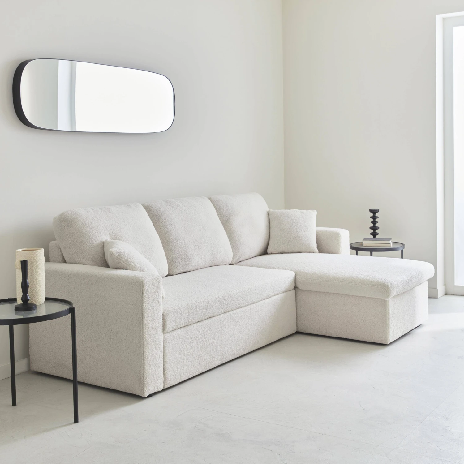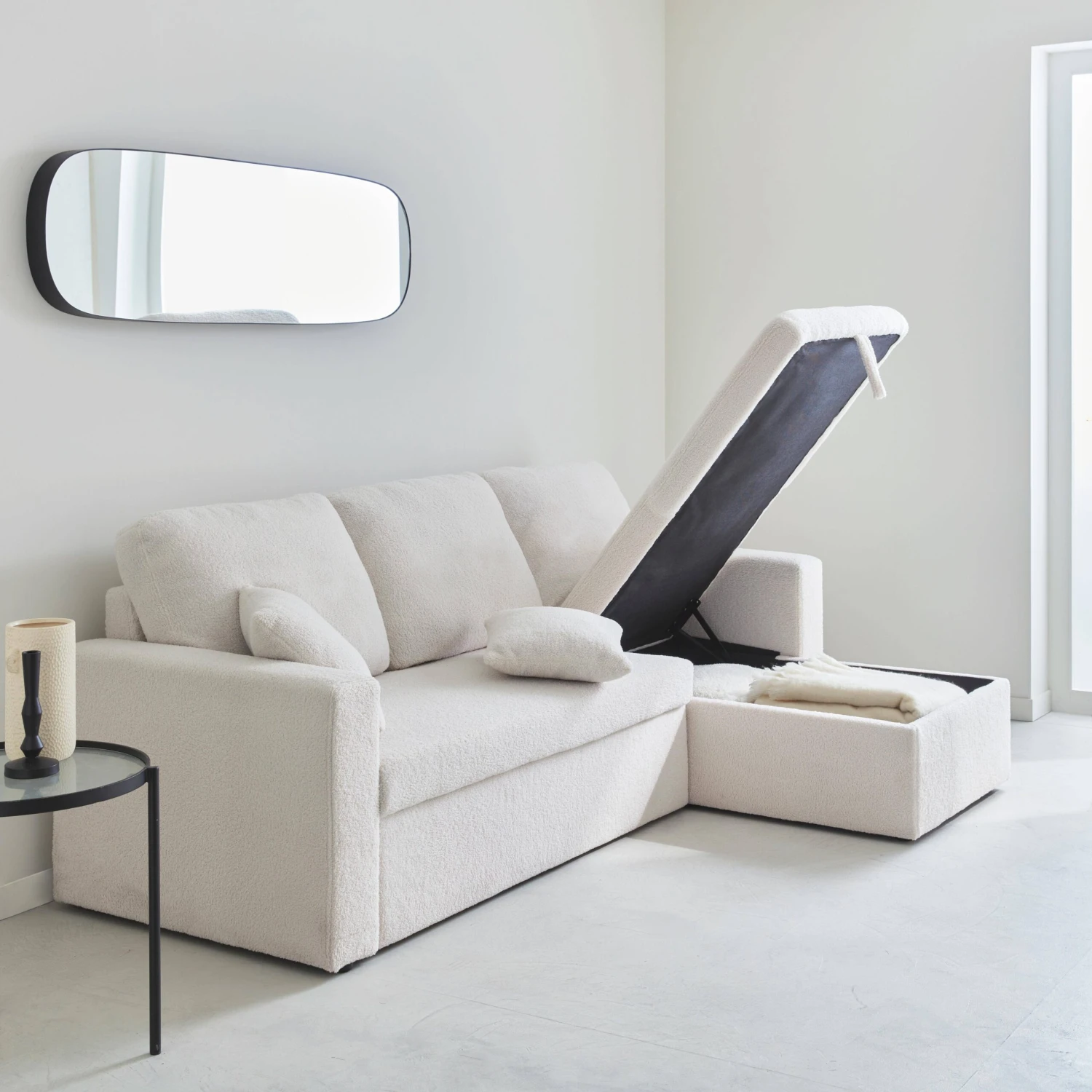 Accordez-vous une pause confort sur notre canapé Ida et ses deux petits coussins inclus. Contemporain et élégant, il a tous les critères pour vous séduire. Son assise est ferme et ses dossiers confortables. Avec son revêtement bouclettes tout doux, effet laine de mouton, vous n’aurez qu’une envie, vous blottir dans ce petit cocon. Des invités imprévus ? Vous pouvez compter sur ce canapé qui se transforme en lit (132,5×191,5 cm) pour deux personnes. Il suffit de retirer les coussins, de relever le tiroir-lit et le tour est joué ! Et comme nous avons pensé à tout, sous la méridienne se cache un coffre de rangement pour ranger draps et couvertures. Méridienne à gauche ou à droite ? Avec ce canapé-lit qui s’adapte à votre intérieur, c’est vous qui choisissez.