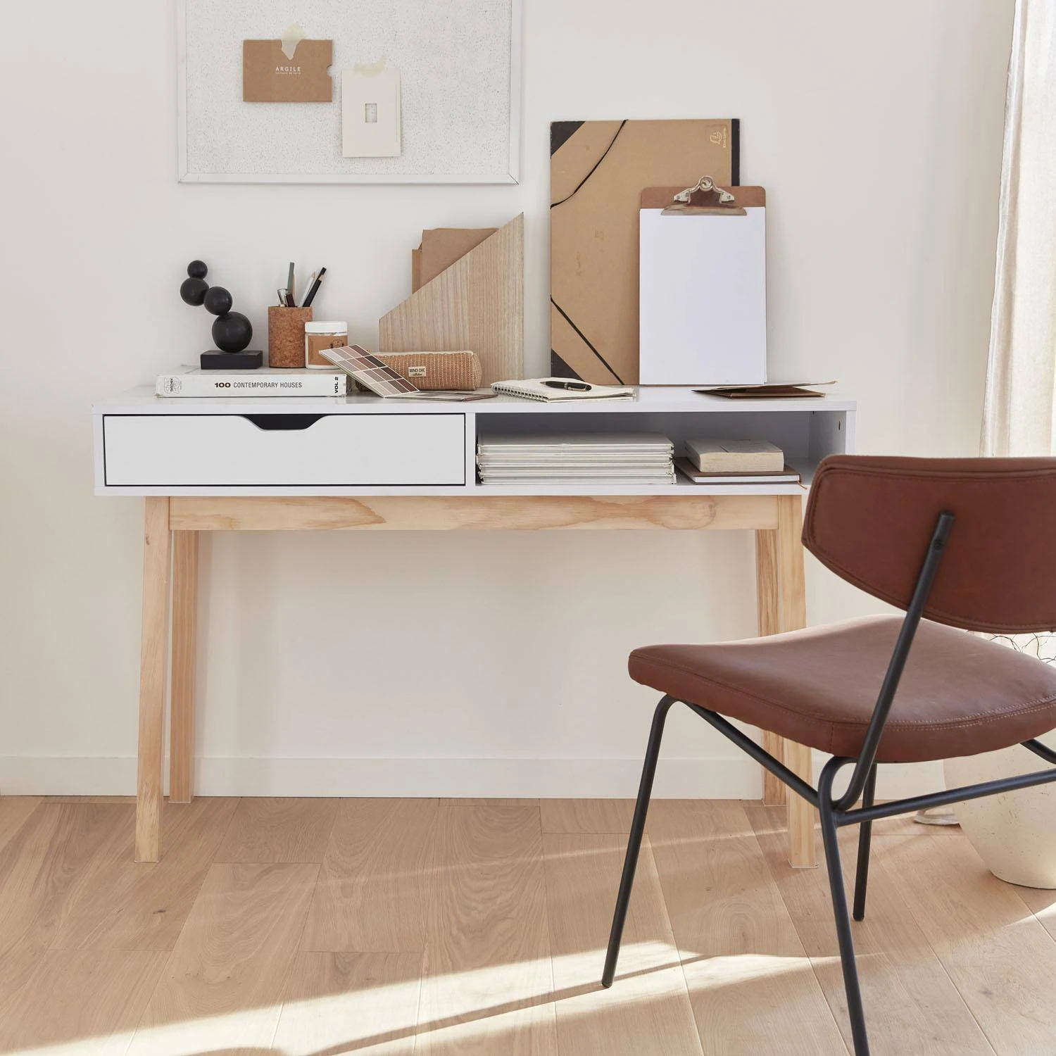 Des lignes épurées et des couleurs naturelles, voilà une console pleine de charme qui apportera une touche scandinave dans votre intérieur. On aime ses pieds compas qui ajoute une touche vintage. Cette console peut aussi être utilisée comme coiffeuse dans une chambre, il suffira de lui ajouter un joli miroir.