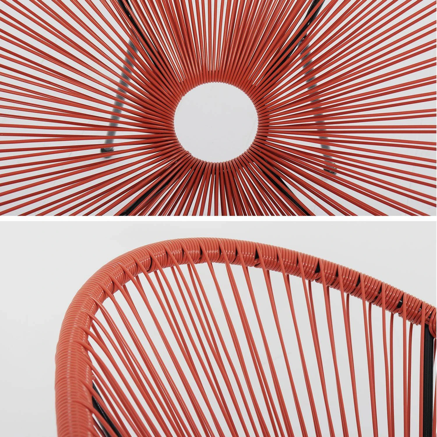 Les fauteuils Acapulco sont résistants grâce à leur structure tubulaire en acier. Elle est recouverte d’une peinture époxy noire qui empêche l’apparition de rouille. L’assise est constituée de fils ajourés, tendus à partir de la structure en métal. Il s’agit d’un cordage artisanal façon scoubidou, fait main. Les fauteuils sont dotés de 4 pieds pour offrir une bonne stabilité. Les pieds sont à monter. Il est possible de les dévisser pour empiler les fauteuils et donc faciliter le rangement.