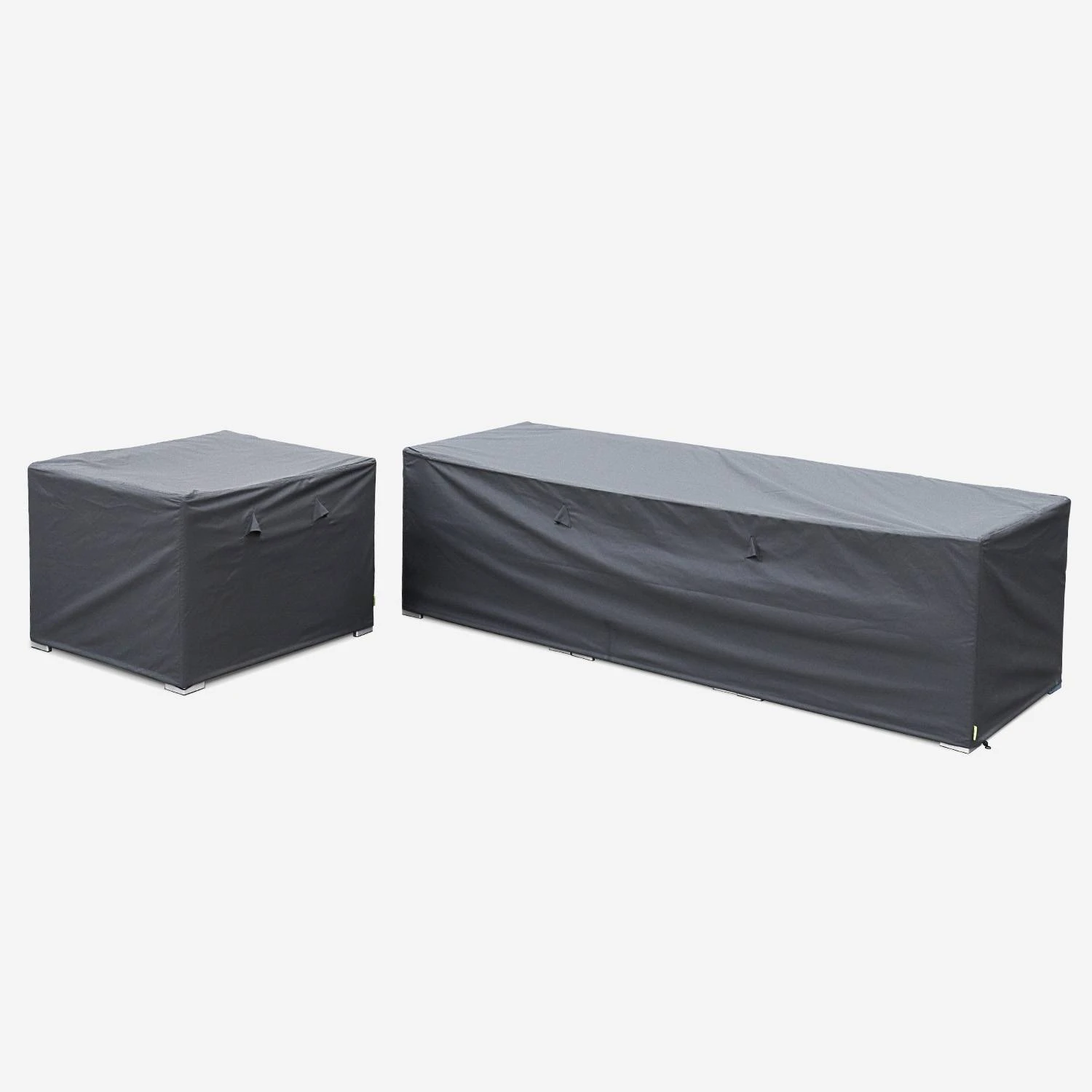Protégez votre salon de jardin lorsque vous ne l’utilisez pas pour allonger sa durée de vie. Ces deux housses sont en polyester avec un revêtement en polyamide. Déperlantes et imperméables grâce à l’enduction PA, elles préservent votre ensemble de jardin de la pluie, de la poussière et du soleil. Cela évite l’usure et les dégradations liées aux intempéries. Pratiques, ces housses traitées anti UV sont dotées d’un cordon de serrage avec œillets intégrés. Ce cordon est inséré dans l’ourlet et il ressort dans les angles, cela permet de maintenir les housses sur le salon de jardin. Deux aérateurs placés sur chaque housse empêchent la condensation. L’air libre circule également par le bas. Ainsi, les risques de moisissures sont évités.