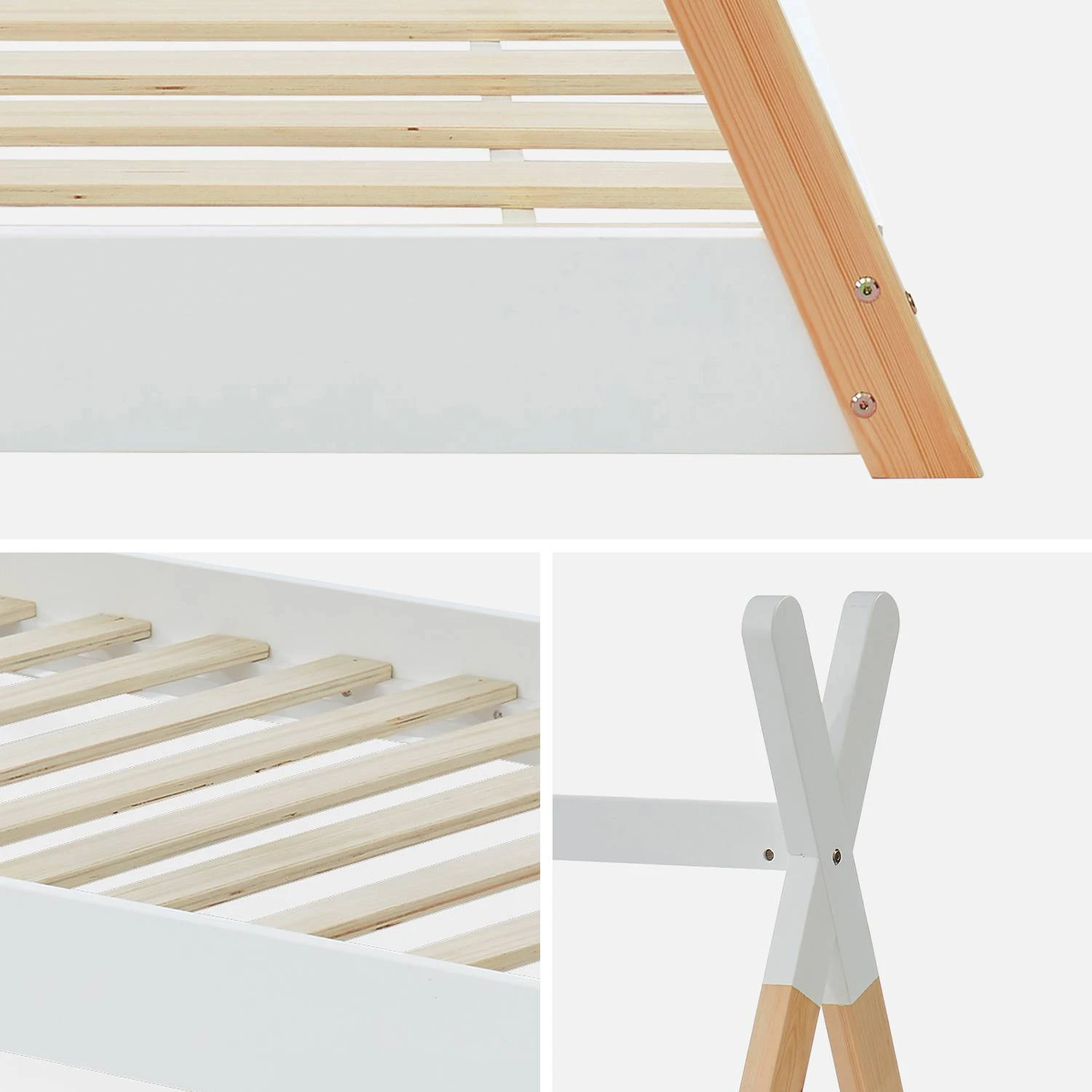 Ce lit tipi sera apprécié par les enfants et par leurs parents. Adapté aux plus petits, il deviendra vite un vrai petit cocon pour votre chérubin qui pourra s’inventer de belles histoires et s’endormir avec des rêves plein la tête. Conçu en bois de pin naturel et en MDF, il a un style épuré qui rappelle le design scandinave et se fond dans n’importe quelle chambre. Le sommier à lattes est inclus avec le lit.
