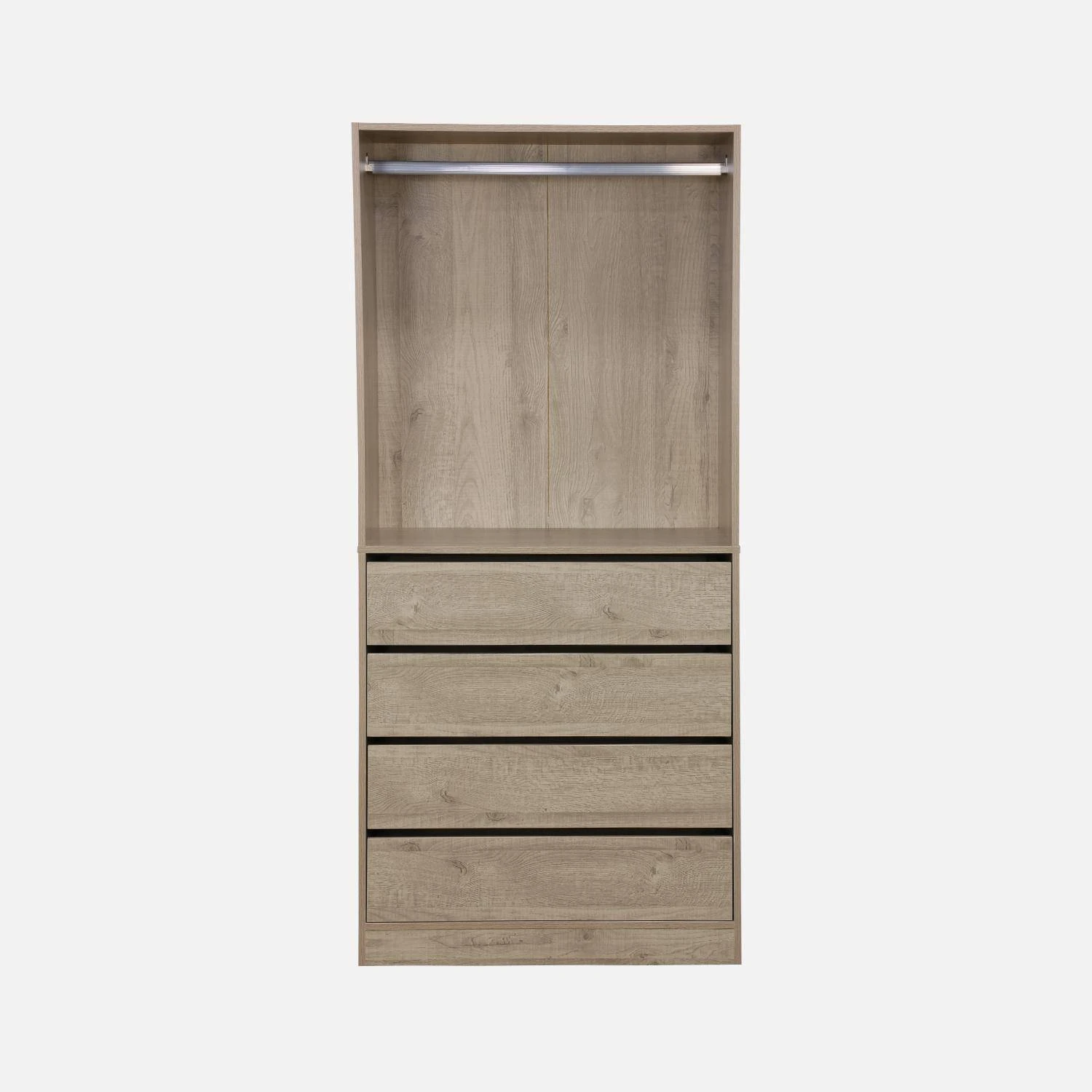 Avec ses 4 tiroirs et sa penderie, ce module dressing offre de belles possibilités de rangement. La penderie vous permet de pendre les vêtements que vous ne souhaitez pas plier et ses tiroirs vous permettront de ranger facilement vos vêtements. Sa couleur sobre et son design moderne lui permet de trouver facilement sa place dans votre maison.