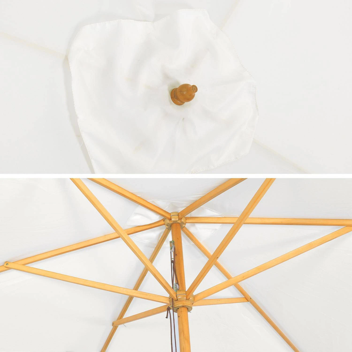 La structure du parasol Cabourg est en bois. La toile est en polyester enduit d’un produit hydrofuge qui la rend déperlante. Le mât s’insère dans n’importe quel pied de parasol compatible avec les mâts de 38mm de diamètre.