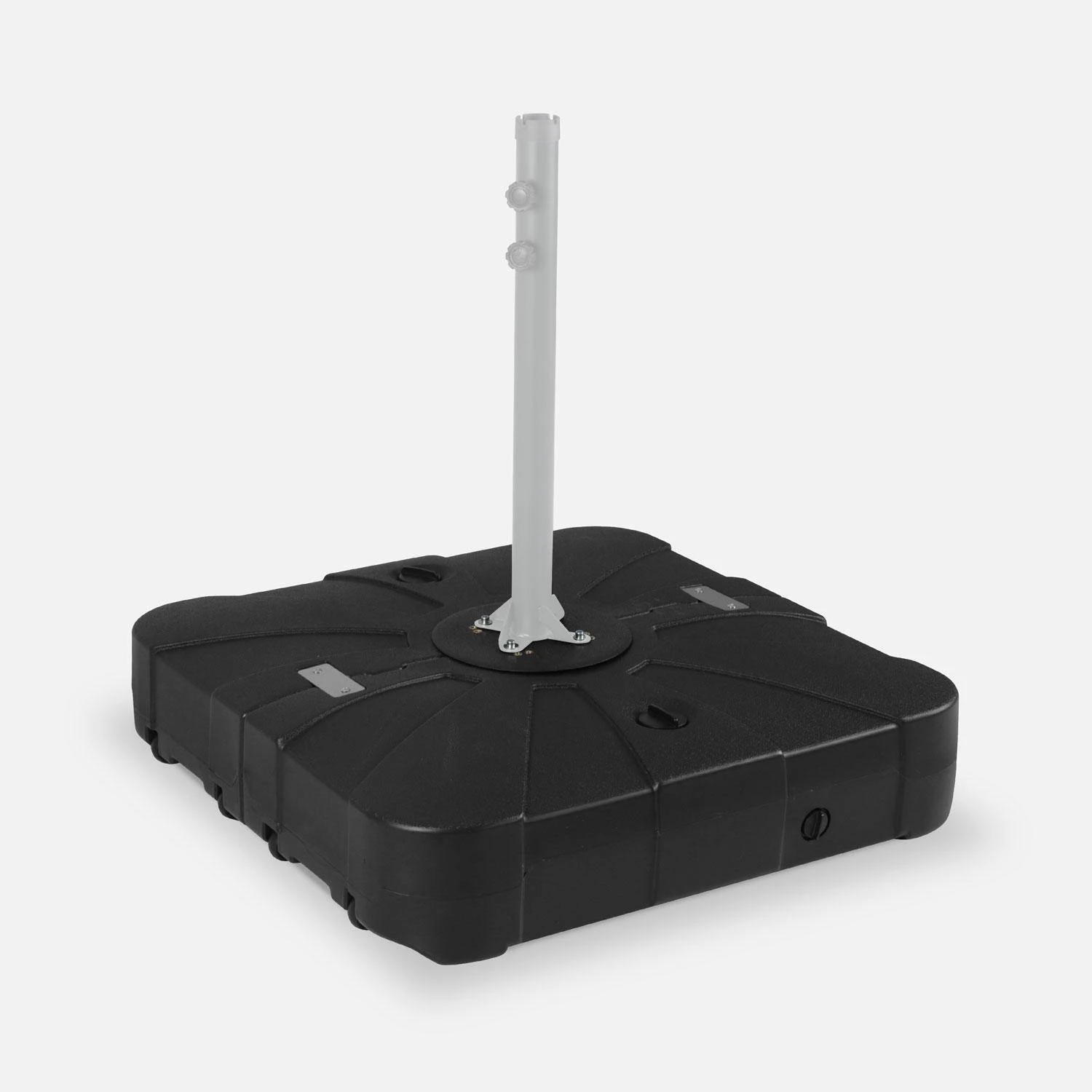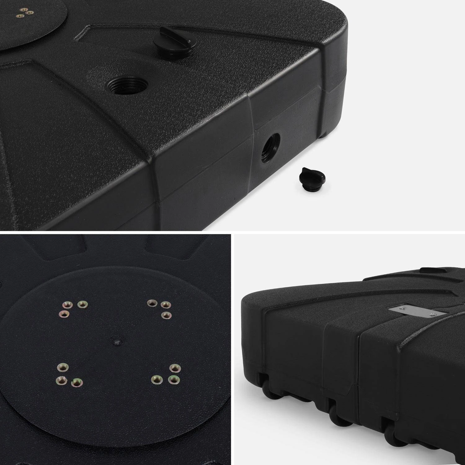Cette base en plastique permet de lester votre parasol déporté sweeek. Une fois remplie, elle peut atteindre jusqu’à 135 kg ce qui lui permet de lester les plus grands parasols. Elle est composée de deux dalles remplissables en plastique qui se fixent sur un pied en croix. Pratique, ce pied est résistant aux chocs et aux intempéries et se déplace facilement grâce aux 4 roulettes latérales dont il est muni. Il suffit de fixer le mât de votre parasol sur la base à l’aide des différents trous prévus. Intégré dans la base, le pied en croix garantit stabilité et résistance.