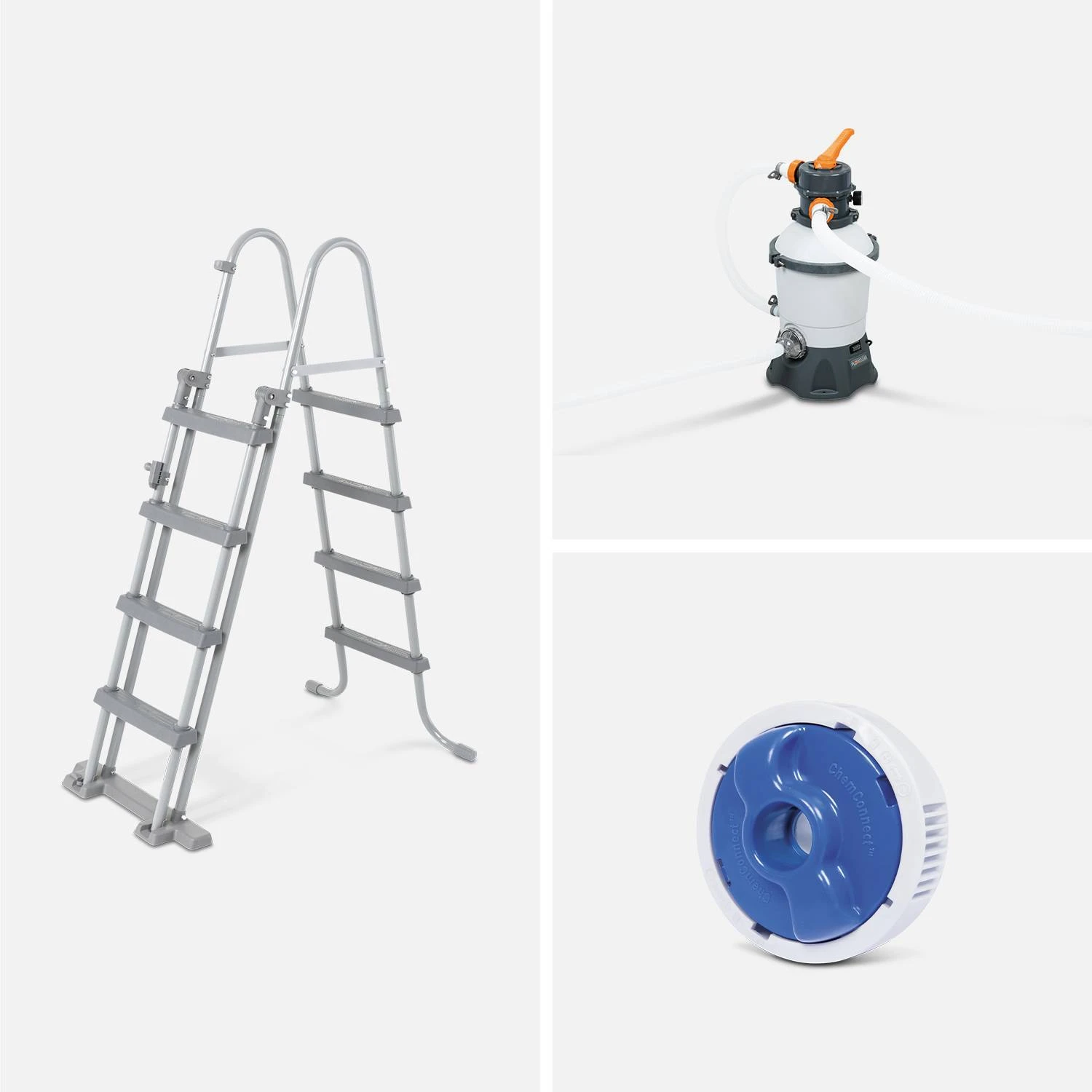 La piscine Aventurine est livrée avec un filtre à sable de 3028 L/h (sable non inclus) pour une eau toujours propre. La piscine se monte en 45 minutes. Pratique, elle se démonte également facilement pour être stockée l’hiver, sans difficulté. Elle est accompagnée d’une échelle 3 marches et d’une bâche de protection 4 saisons. Les marches extérieures peuvent être relevées pour éviter que les enfants entrent dans la piscine, sans surveillance.