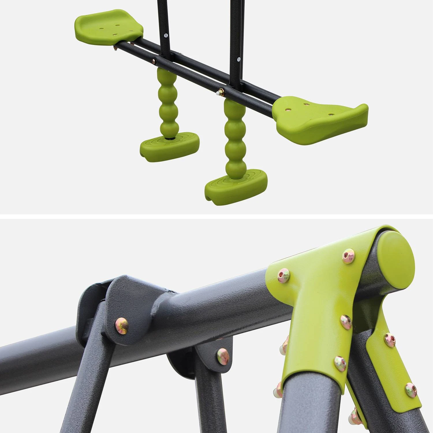 Le portique Tramontane est solide et fiable. Sa structure métallique est recouverte d’une jolie peinture époxy. Non seulement esthétique, elle limite la corrosion. La quincaillerie est en acier galvanisé et ne rouille pas. Les assises sont robustes et imputrescibles. En effet, elles sont en plastique et moulées par injection. Le cordage est synthétique.