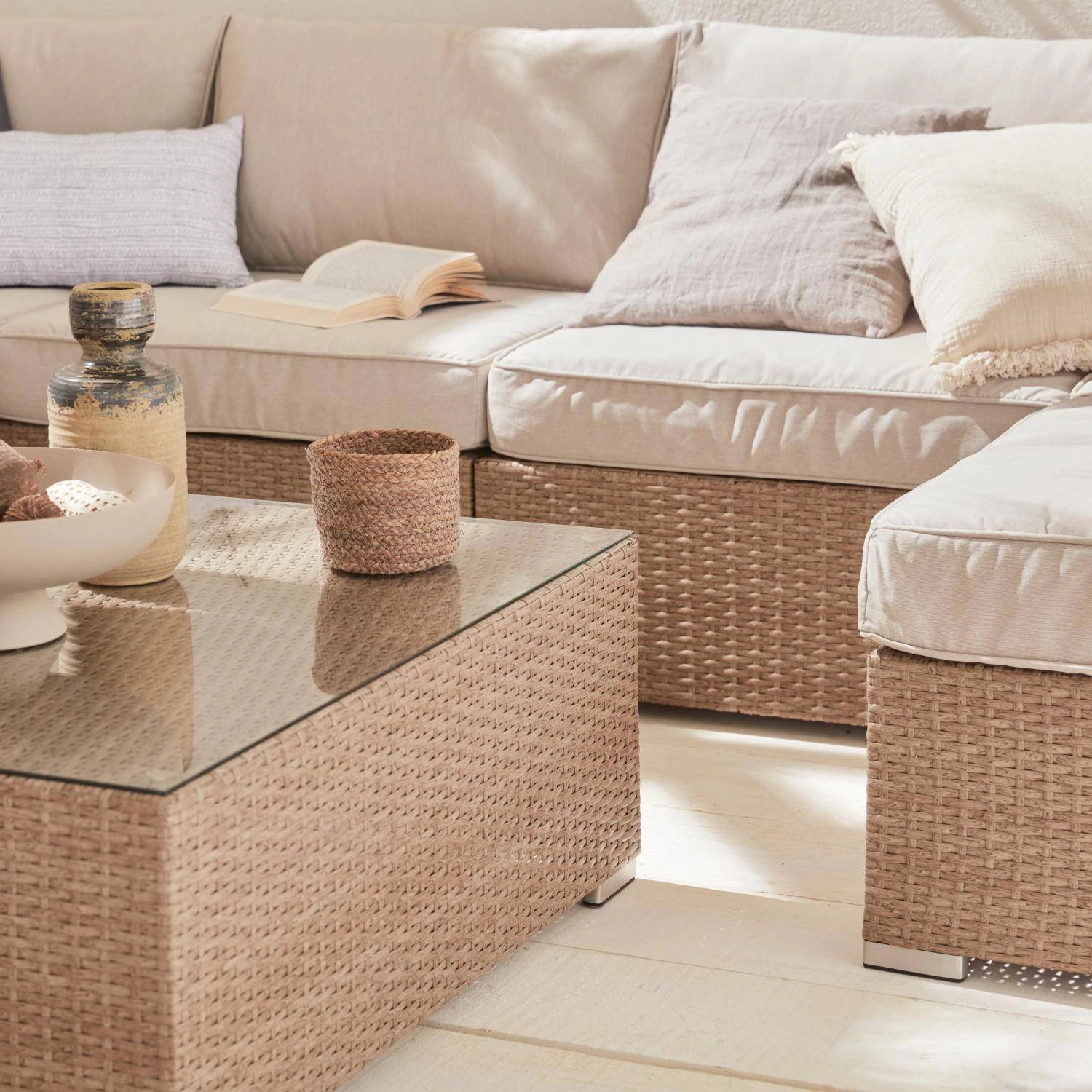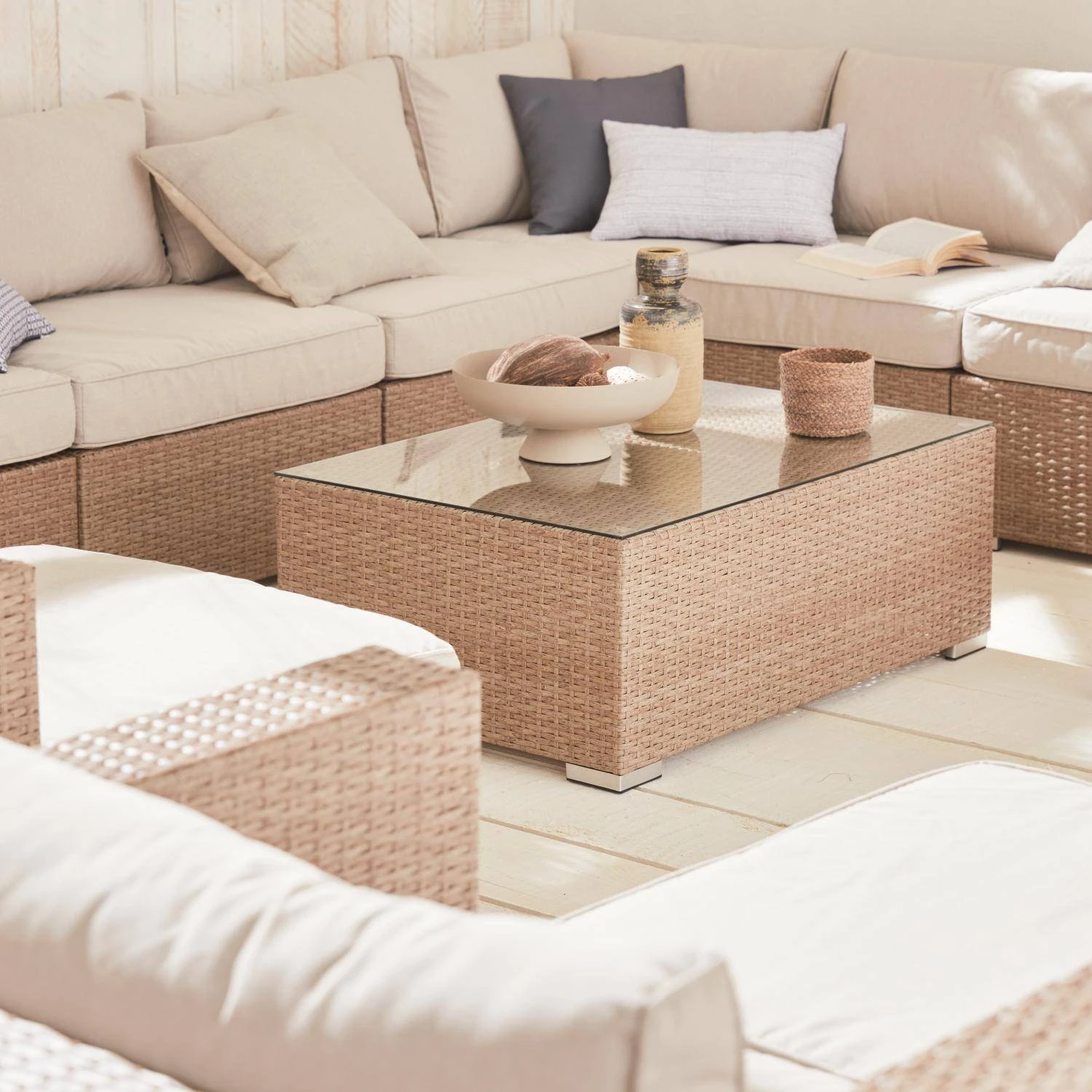 sweeek sélectionne avec attention la qualité de la matière choisie pour le tressage. De ce fait, la durée de vie du Tripoli est exceptionnelle ! La résine tressée sweeek supporte les rayons du soleil et les intempéries (neige/ pluie / eaux salées). Les coussins sont déhoussables et résistants à l’eau. Pour garantir une résistance maximale, la structure du salon de jardin est en aluminium renforcé (ne rouille pas par nature). Les structures en aluminium sont, en plus, bien plus légères que les structures en acier. Le plateau en verre des tables basses est en verre trempé de 5mm d’épaisseur. C’est un verre 5 fois plus résistant que le verre traditionnel ! Le Tripoli est livré avec un lot de 18 connecteurs pour fixer les différents modules ensemble.