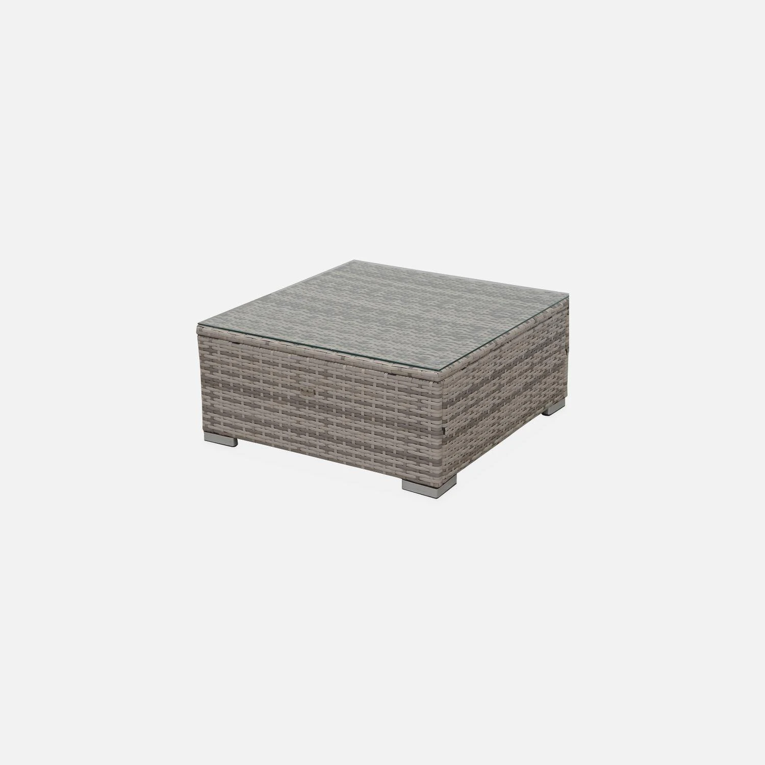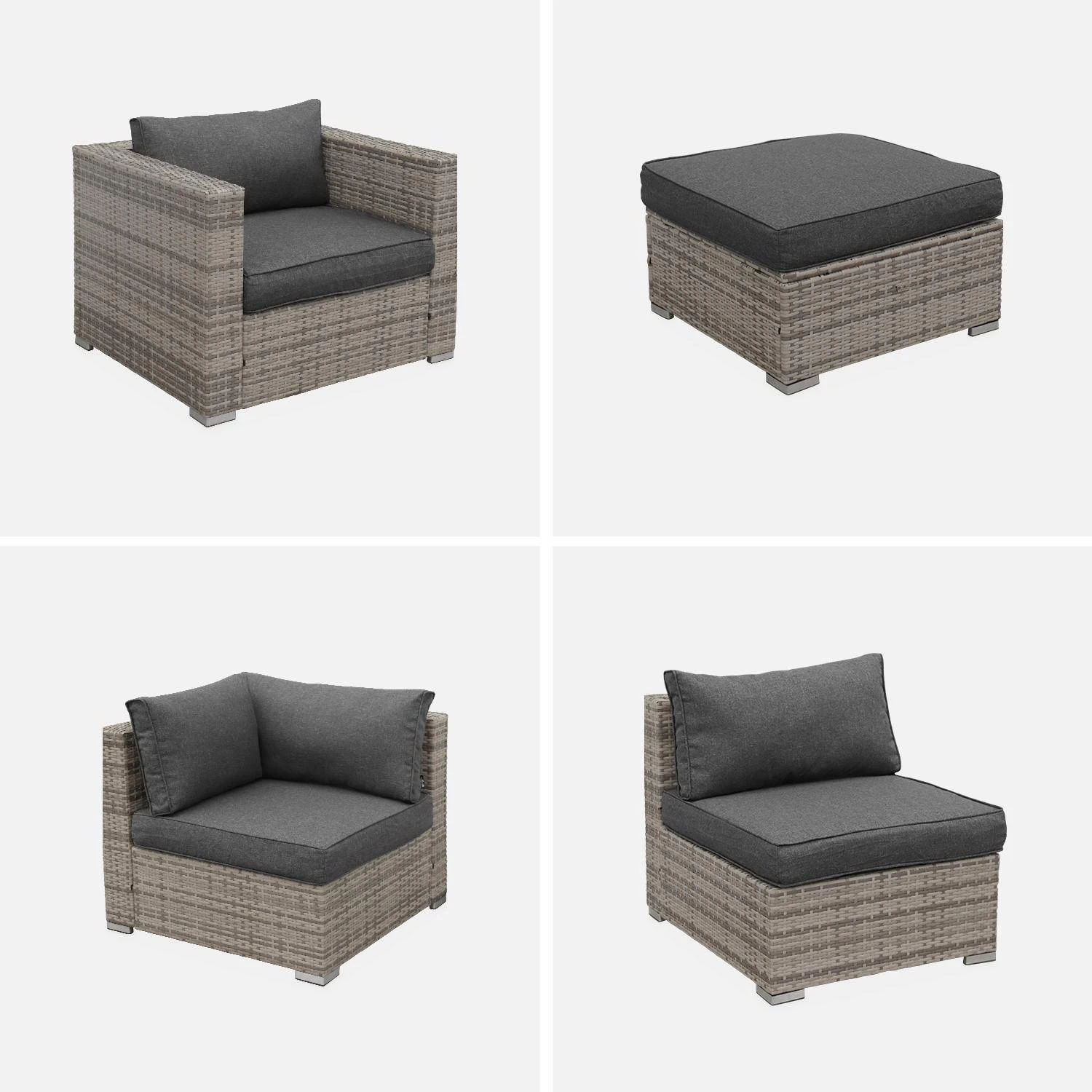 sweeek sélectionne avec attention la qualité de la matière choisie pour le tressage. De ce fait, la durée de vie du Caligari est exceptionnelle ! La résine tressée sweeek supporte les rayons du soleil et les intempéries (neige/ pluie / eaux salées). Les coussins sont déhoussables et résistants à l’eau. Pour garantir une résistance maximale, la structure du salon de jardin est en aluminium renforcé (ne rouille pas par nature). Les structures en aluminium sont, en plus, bien plus légères que les structures en acier. Le plateau en verre de la table basse est en verre trempé de 5mm d’épaisseur. C’est un verre 5 fois plus résistant que le verre traditionnel ! Le Caligari est livré avec un lot de 6 connecteurs pour fixer les différents modules ensemble.