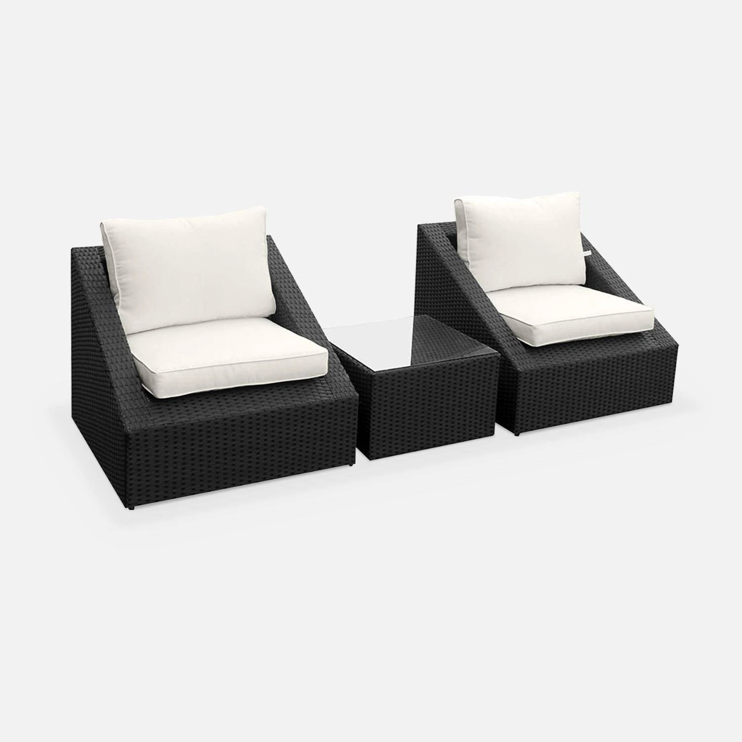 Ce salon de jardin est pour le moins original ! Ses fauteuils de forme triangulaire s’installent face à face ou côte à côte, selon vos envies. Ils se superposent et forment un rectangle, pour ne pas prendre de place lorsqu’ils ne sont pas utilisés.
