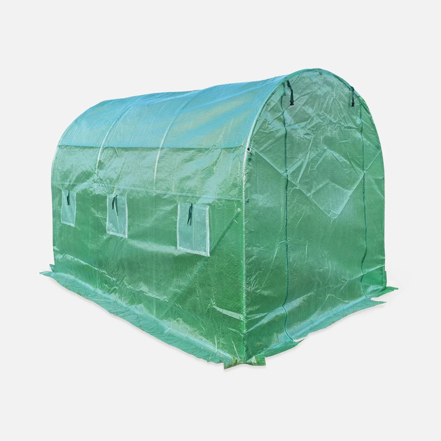 De couleur verte, cette serre maraichère trouvera aisément sa place dans les jardins. Sa toile en polyéthylène de 140g/m² est robuste et souple. Le polyéthylène est traité anti-UV. Grâce à ce traitement, les rayons ultraviolets nuisibles sont arrêtés à 99,9%, la lumière est également répartie, et l’isolation est meilleure. En plus, la structure de la serre est en acier galvanisé pour résister à la corrosion. La serre est donc solide. Les piquets d’ancrage fournis et les débords de toile permettent de fixer la bâche au sol.