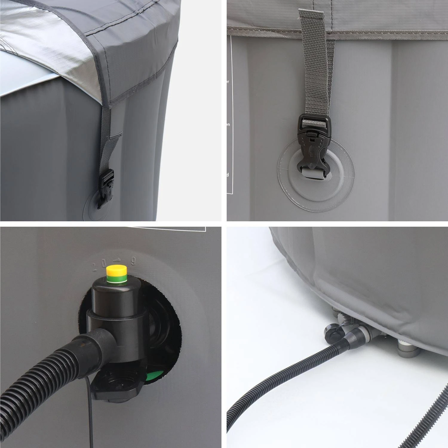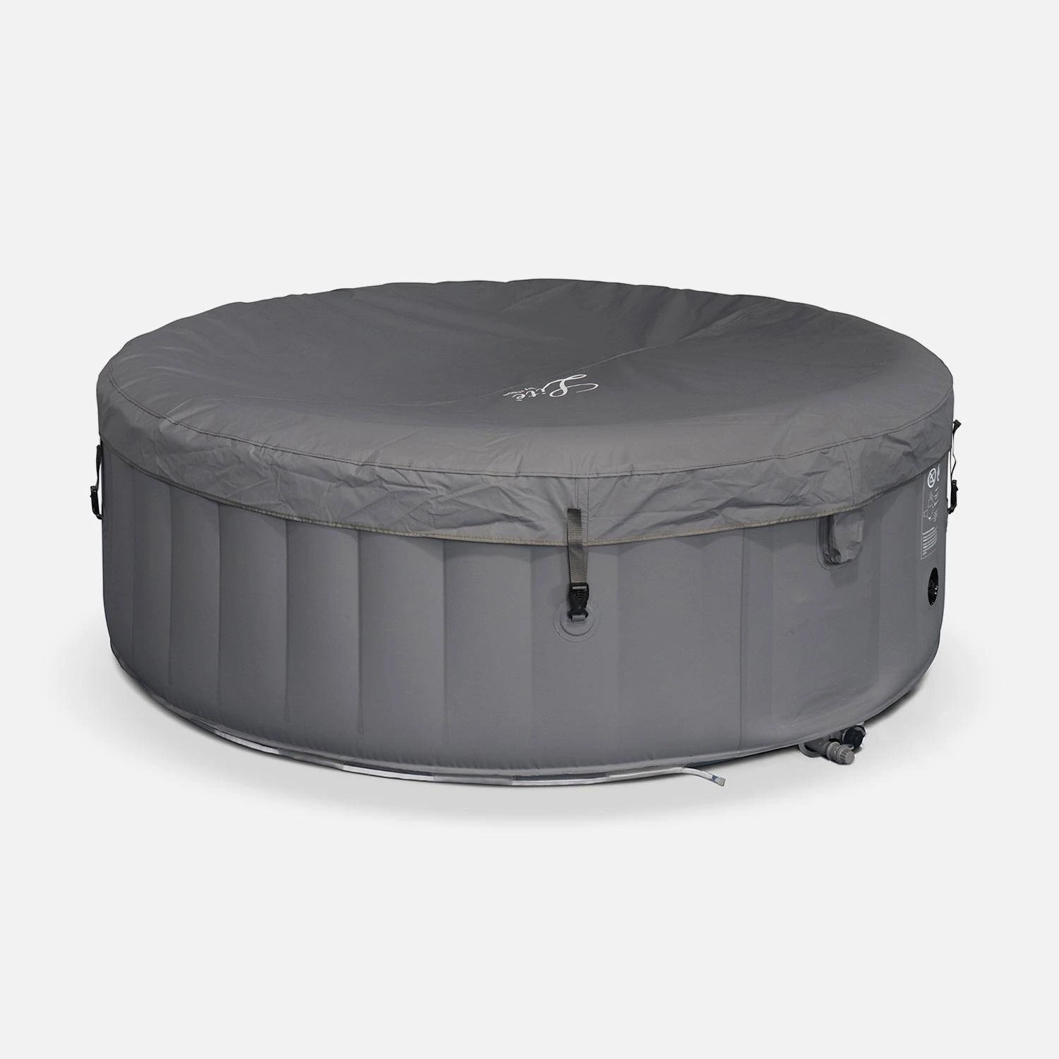Ce spa est simple d’utilisation. La température, la mise en marche, la chauffe différée et les autres fonctionnalités se gèrent grâce à la télécommande filaire étanche. Le gonflage s’effectue par système intégré. Il suffit de brancher le spa, d’enclencher le mode gonflage et de presser une touche de la télécommande, rien de plus simple ! La mise en place est facile et ne nécessite pas d’outil. En 10 minutes, le spa est installé et prêt à accueillir de l’eau. Un système de vidange avec adaptateur pour tuyau d’arrosage permettra de vider votre spa proprement et sans effort.