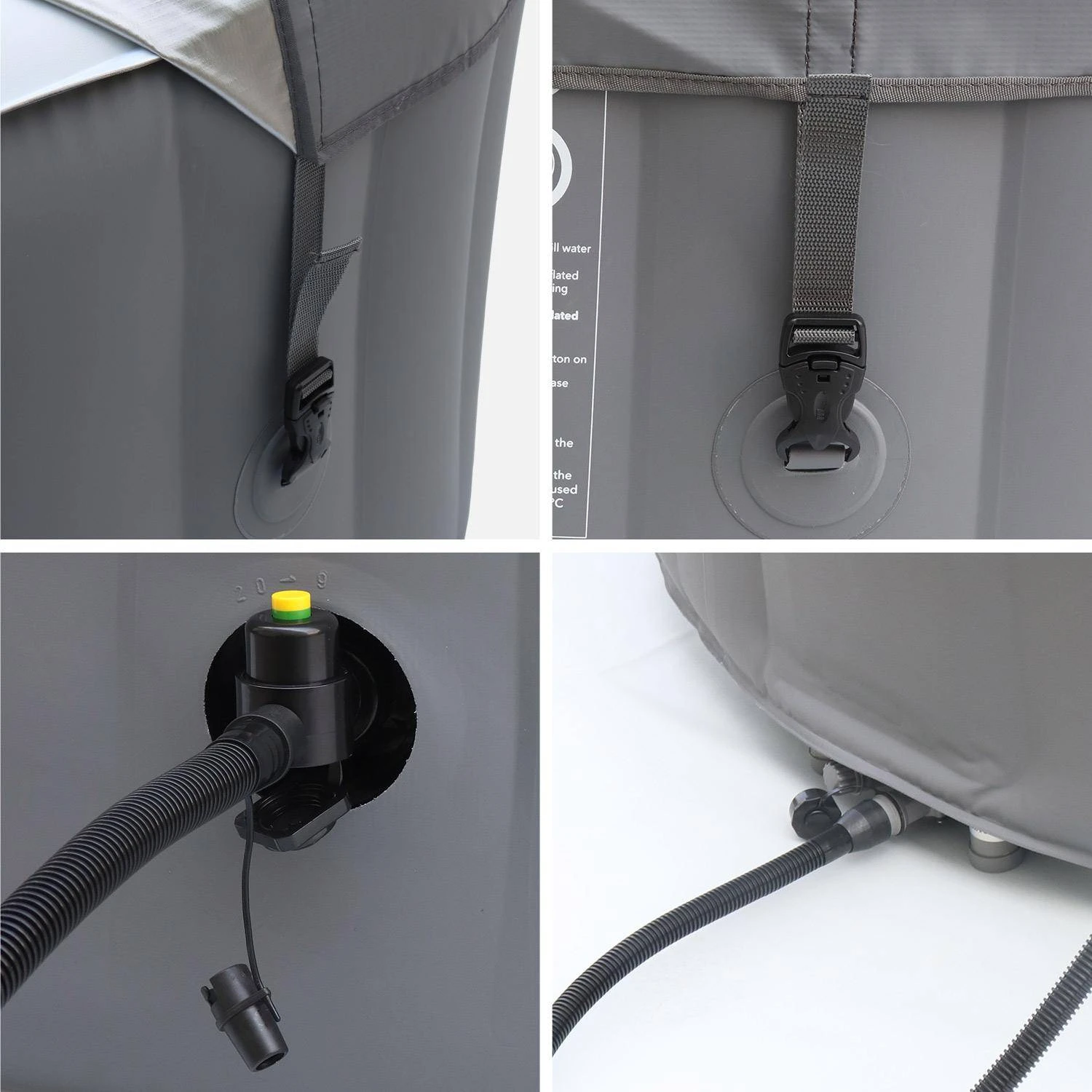 Ce spa est simple d’utilisation. La température, la mise en marche, la chauffe différée et les autres fonctionnalités se gèrent grâce à la télécommande filaire étanche. Le gonflage s’effectue par système intégré. Il suffit de brancher le spa, d’enclencher le mode gonflage et de presser une touche de la télécommande, rien de plus simple ! La mise en place est facile et ne nécessite pas d’outil. En 10 minutes, le spa est installé et prêt à accueillir de l’eau. Un système de vidange avec adaptateur pour tuyau d’arrosage permettra de vider votre spa proprement et sans effort.