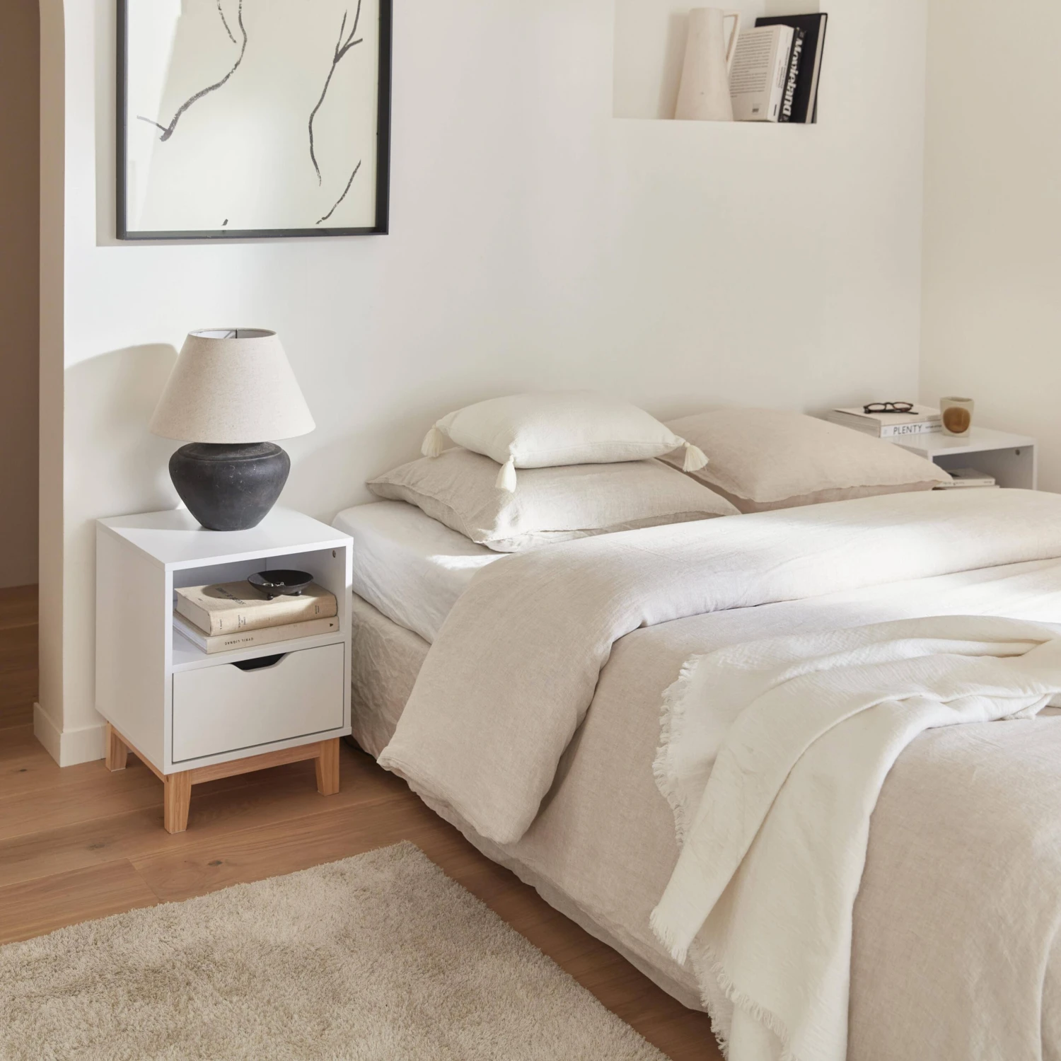 Faites une place dans votre chambre pour nos tables de chevet Floki qui apporteront douceur et lumière dans votre intérieur. Leurs couleurs naturelles s’introduiront facilement dans tous les styles de déco. Avec leurs lignes droites et leurs pieds en bois, ces jolies tables de nuit scandinaves s’inscrivent parfaitement dans la tendance du moment. Côté rangement, la petite niche et le tiroir vous permettront de ranger tout ce dont vous avez besoin pour passer une bonne nuit. Le tiroir est doté d’une encoche pour plus de facilité. Ajoutez une jolie lampe vintage sur son plateau, petit effet déco assuré !
