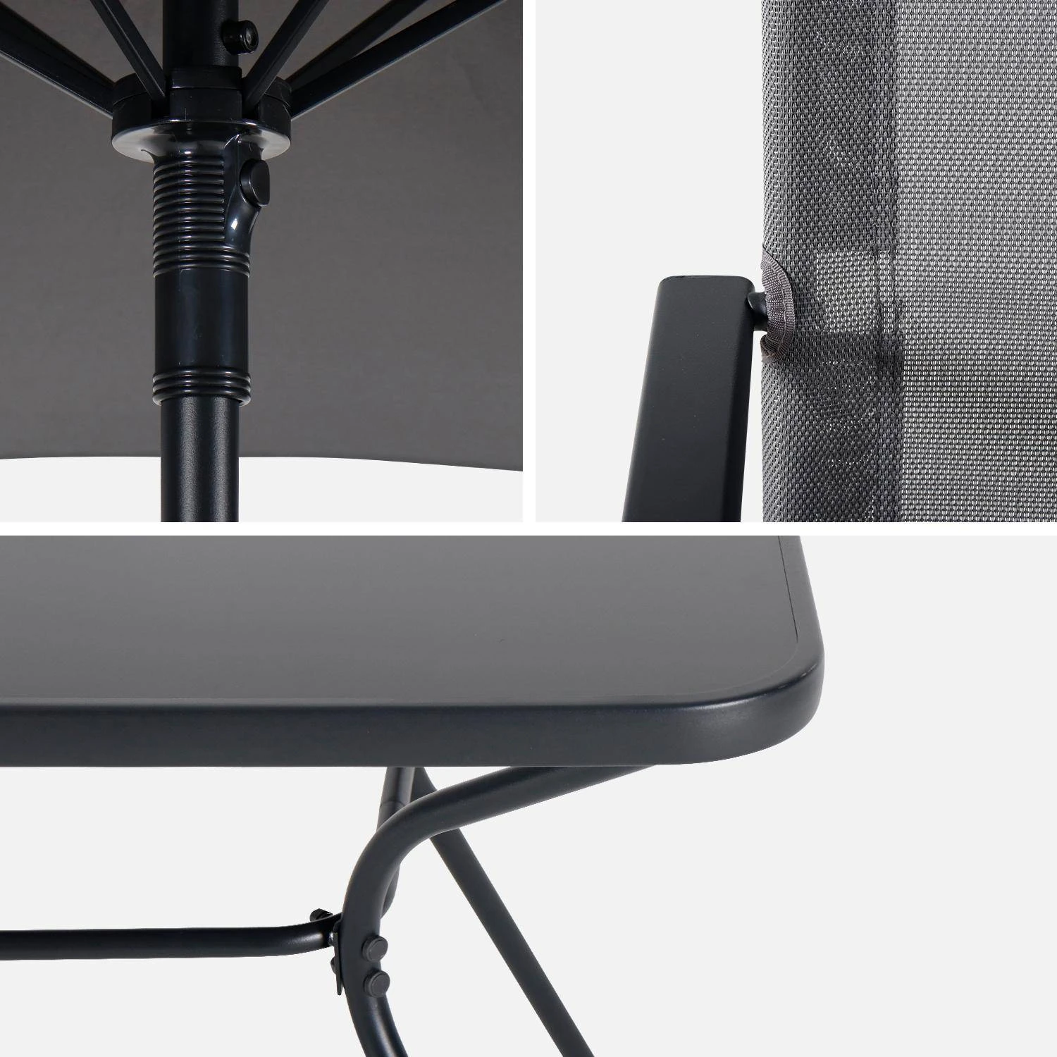 Cet ensemble de jardin complet est idéal pour prendre ses repas en extérieur tout en étant protégé du soleil. Il se compose d’une table, de 6 fauteuils confortables et d’un parasol à mât central qui s’installe grâce au trou de parasol prévu au centre de la table. Les fauteuils sont pliables pour vous permettre de les ranger facilement quand vous ne les utilisez plus.