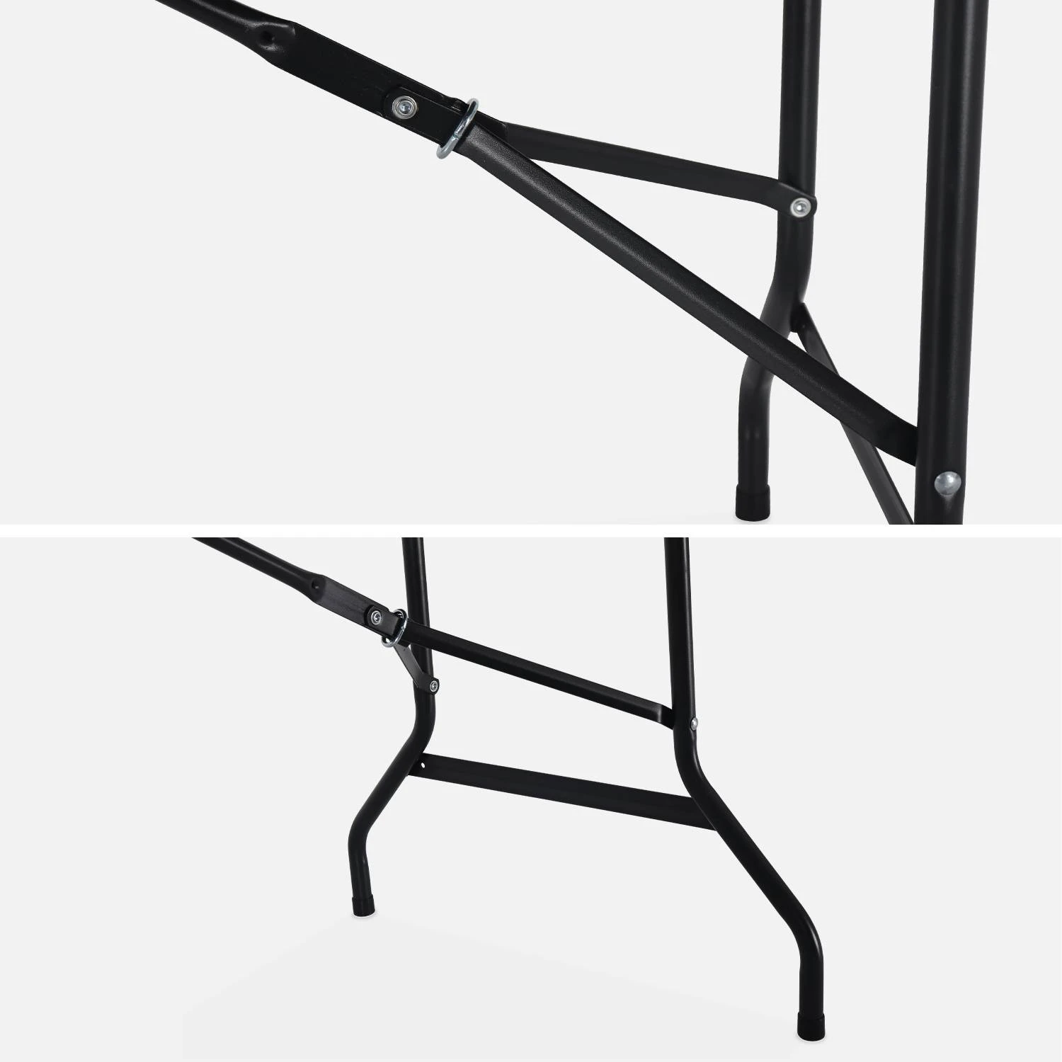 Les tables sont en plastique injecté robuste avec une structure en acier gris. Elles sont resistantes aux intempéries et faciles à nettoyer.